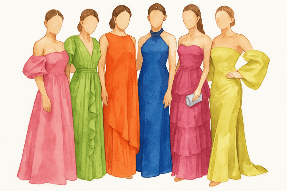 Para as convidadas, indicamos vestidos leves, com tecidos fluidos, cores suaves ou vibrantes. A ideia é um look elegante, mas confortável e com a leveza que a ocasião pede. Como temos uma parte do local em grama, indicamos que usem salto bloco para um maior conforto.